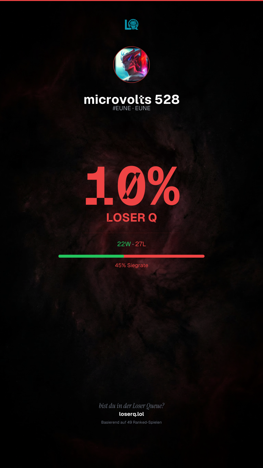 22 Siege, 27 Niederlagen — eine Winrate von 44%. Eine harte Phase.