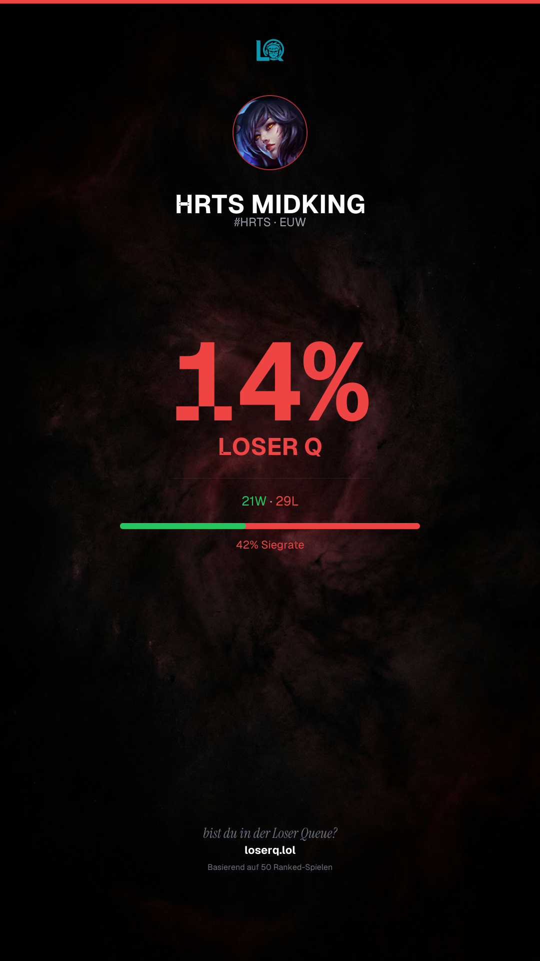21 Siege, 29 Niederlagen — eine Winrate von 42%. Eine harte Phase.