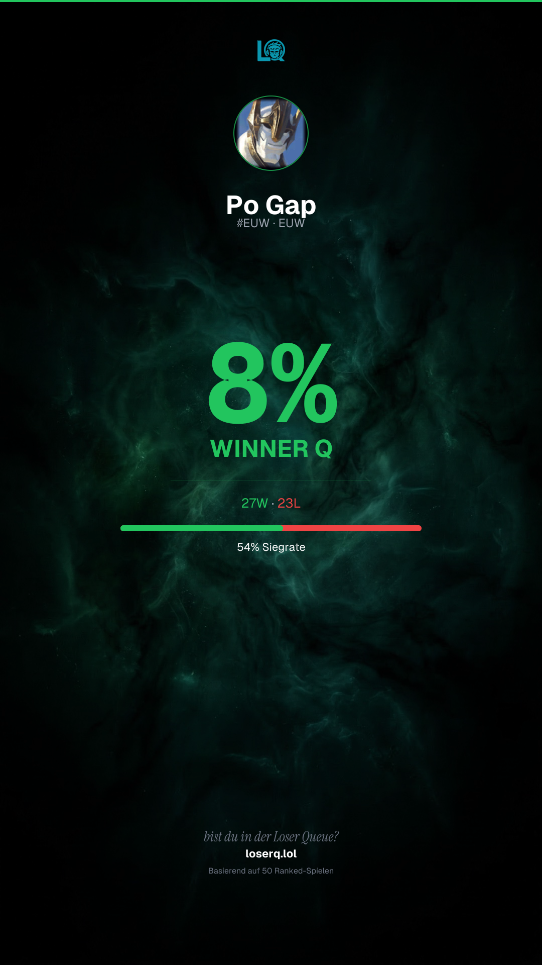 27 Siege, 23 Niederlagen — eine Winrate von 54%.