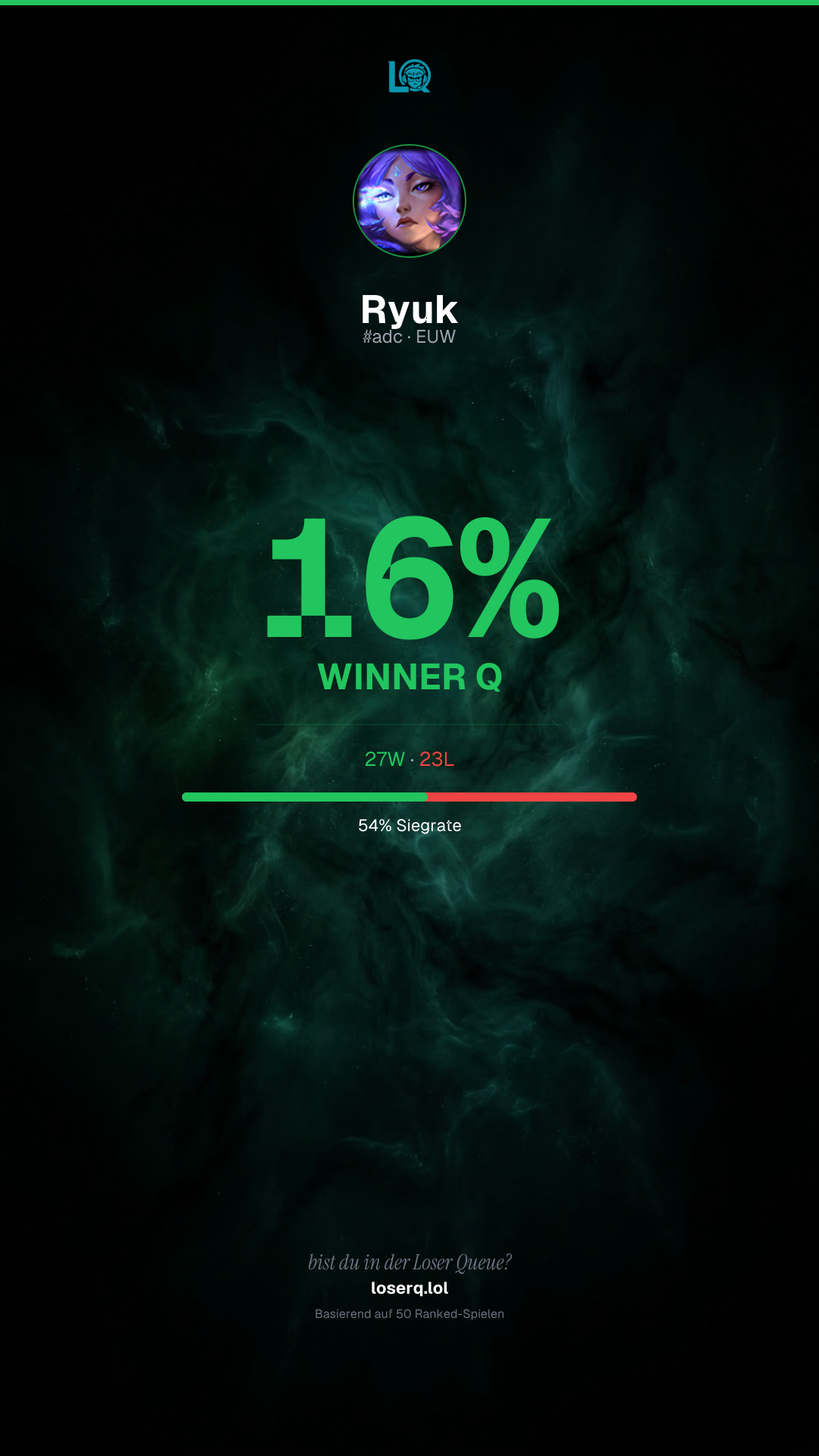 27 Siege, 23 Niederlagen — eine Winrate von 54%.