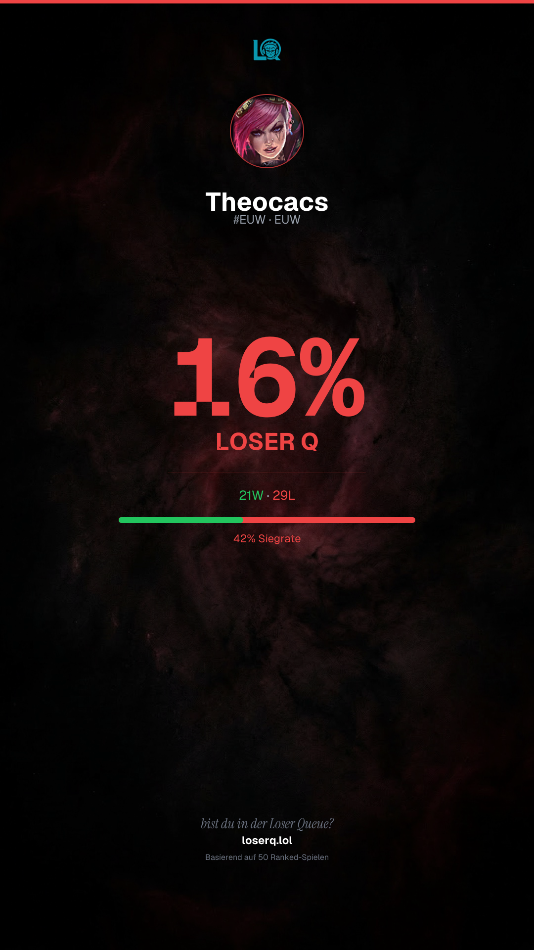 21 Siege, 29 Niederlagen — eine Winrate von 42%. Eine harte Phase.