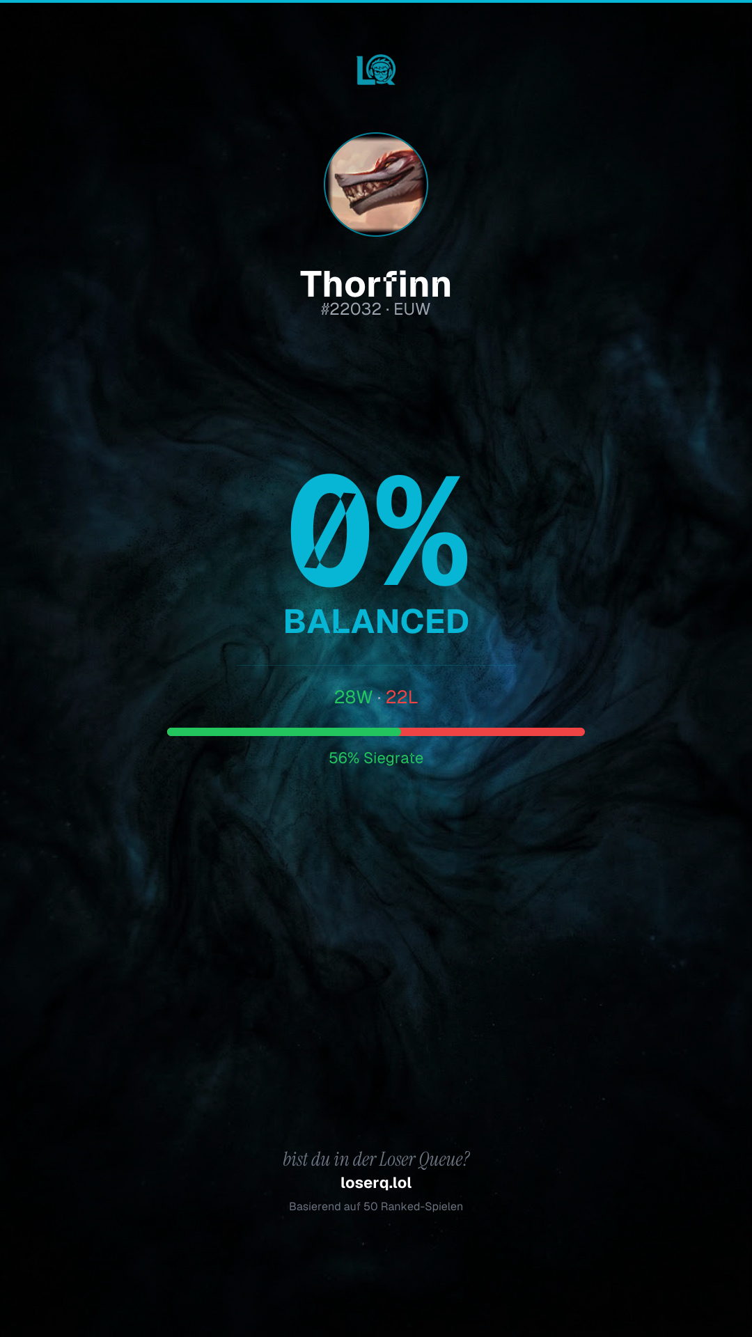 28 Siege, 22 Niederlagen — eine Winrate von 56%. Starke Leistung.
