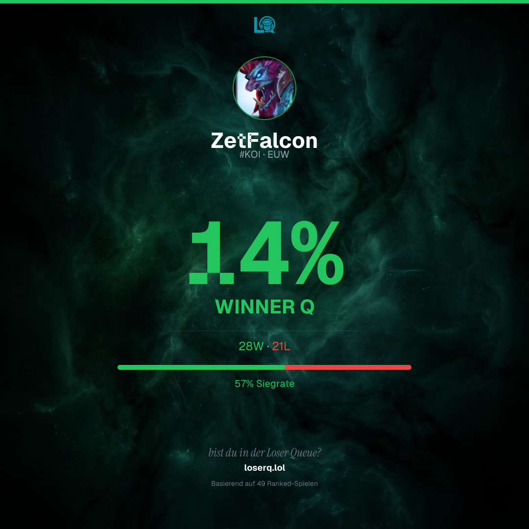 28 Siege, 21 Niederlagen — eine Winrate von 57%. Starke Leistung.