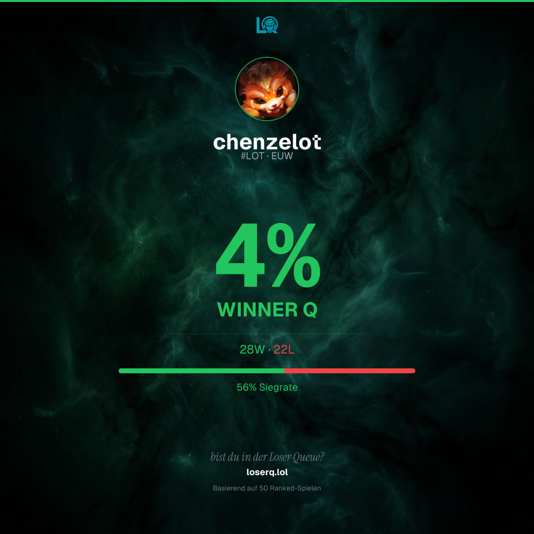 28 Siege, 22 Niederlagen — eine Winrate von 56%. Starke Leistung.