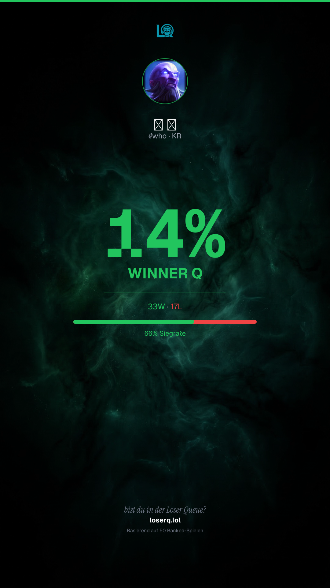 33 Siege, 17 Niederlagen — eine Winrate von 66%. Starke Leistung.