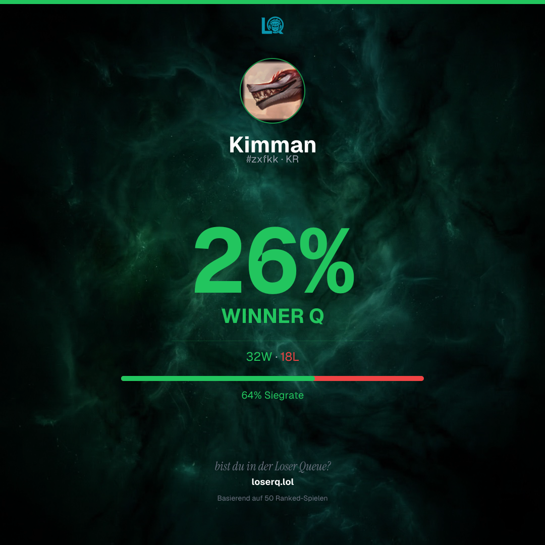 32 Siege, 18 Niederlagen — eine Winrate von 64%. Starke Leistung.