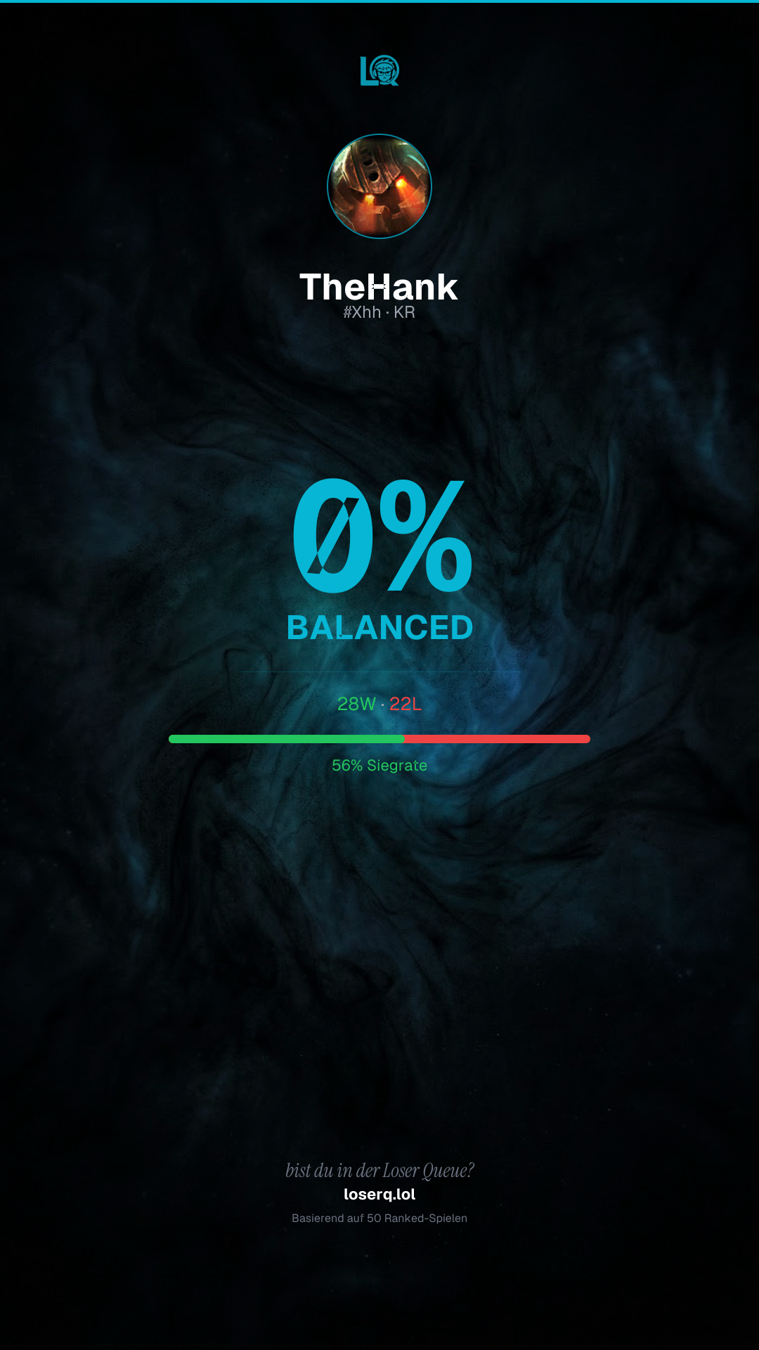 28 Siege, 22 Niederlagen — eine Winrate von 56%. Starke Leistung.
