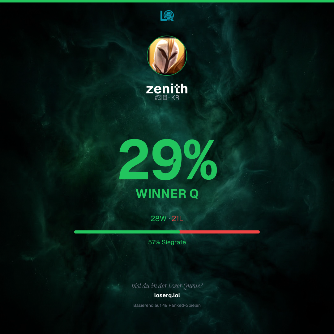 28 Siege, 21 Niederlagen — eine Winrate von 57%. Starke Leistung.