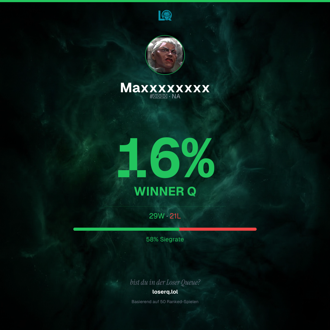 29 Siege, 21 Niederlagen — eine Winrate von 58%. Starke Leistung.