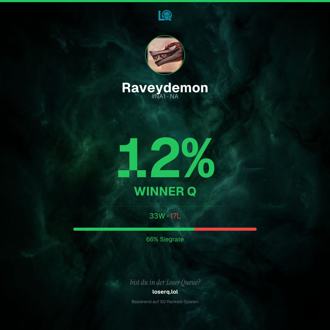 33 Siege, 17 Niederlagen — eine Winrate von 66%. Starke Leistung.