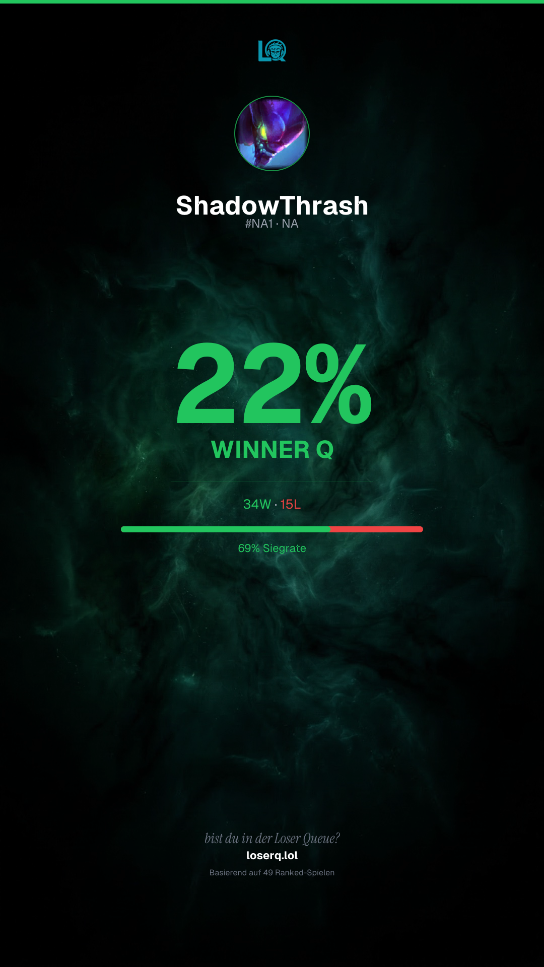 34 Siege, 15 Niederlagen — eine Winrate von 69%. Starke Leistung.