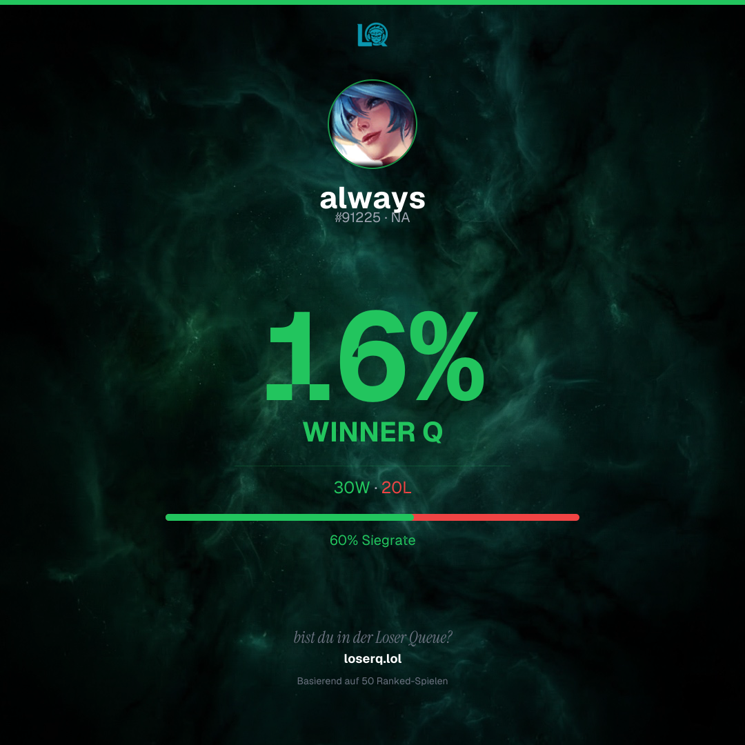 30 Siege, 20 Niederlagen — eine Winrate von 60%. Starke Leistung.