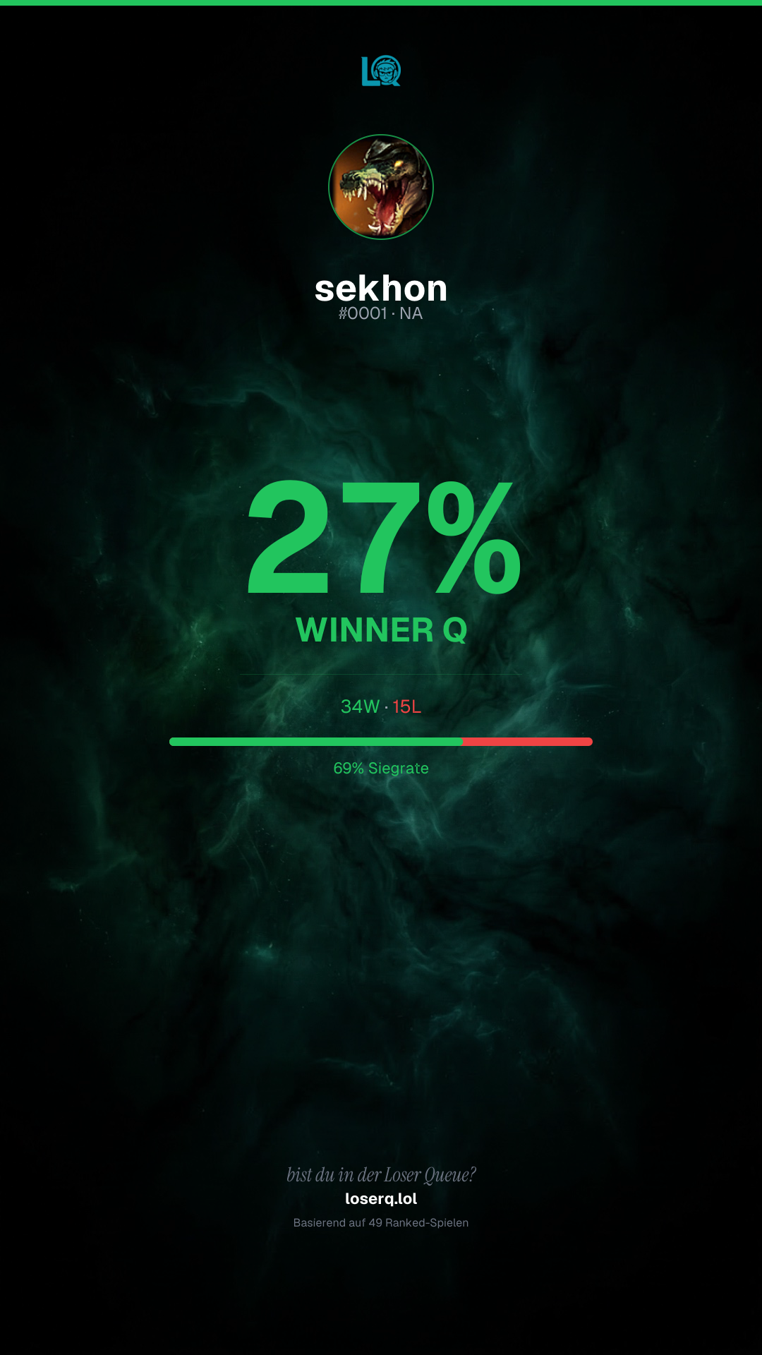 34 Siege, 15 Niederlagen — eine Winrate von 69%. Starke Leistung.