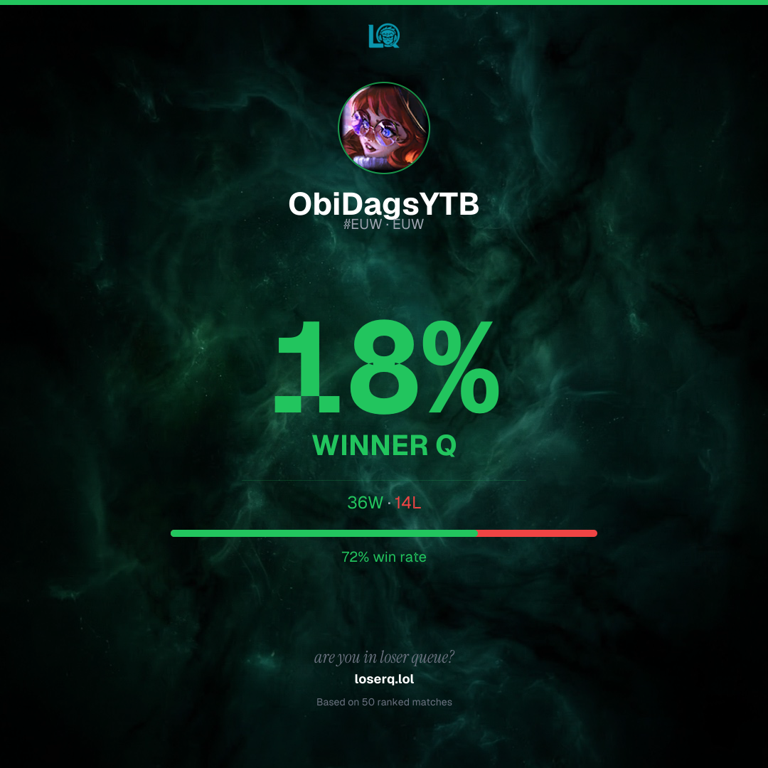 36 wins, 14 losses — a 72% win rate. A strong showing.