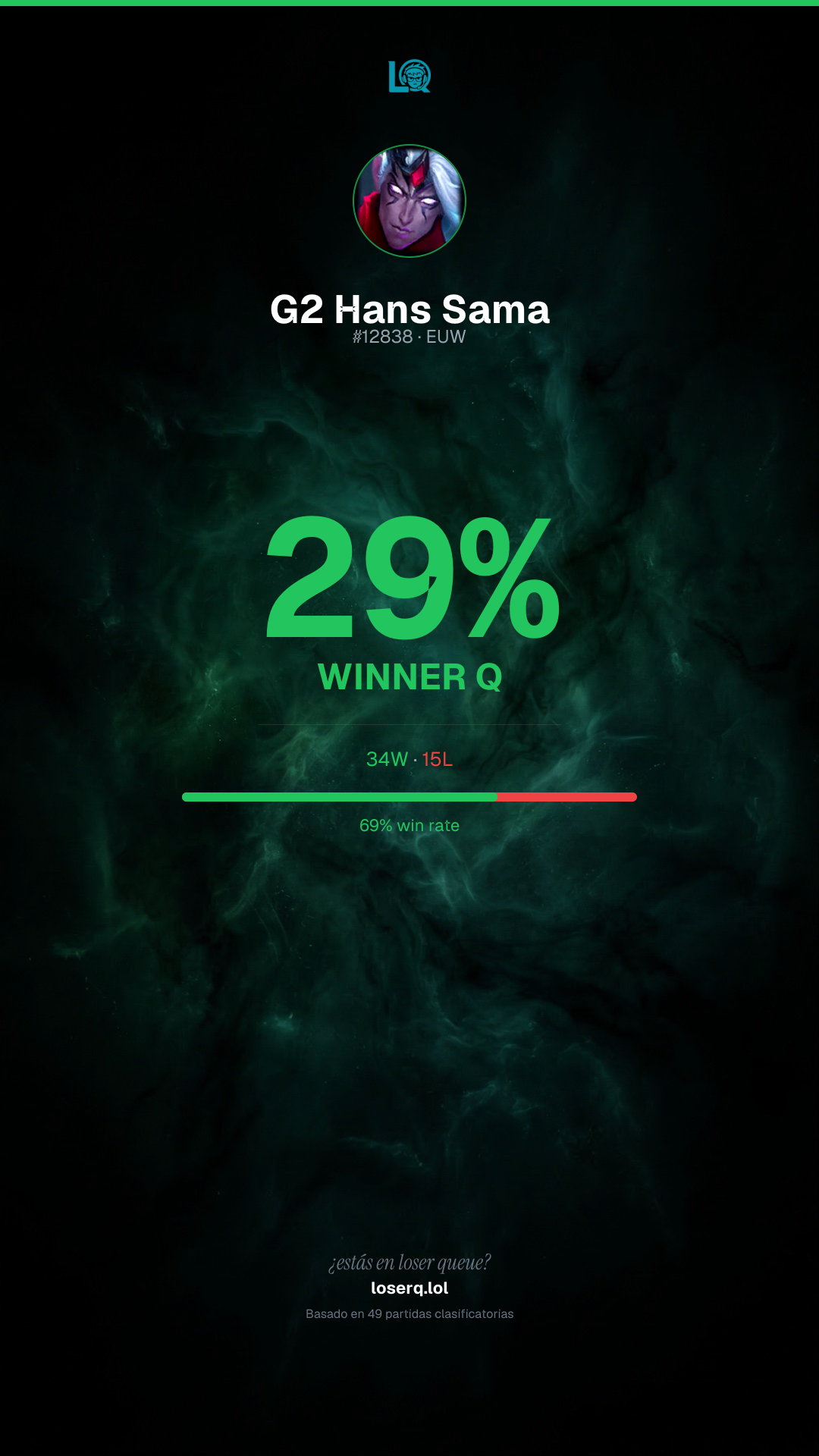 34 victorias, 15 derrotas — 69% de win rate. Un buen desempeño.