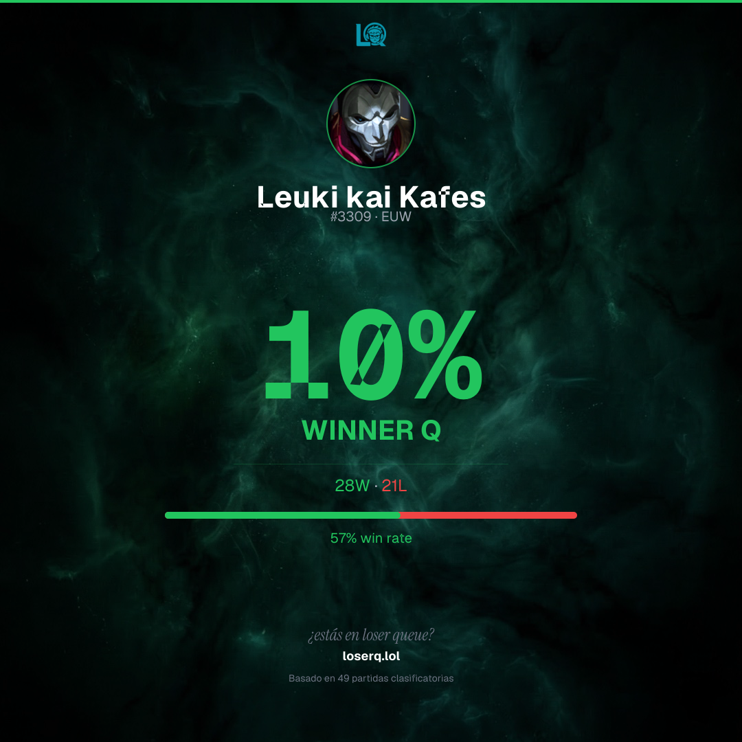 28 victorias, 21 derrotas — 57% de win rate. Un buen desempeño.
