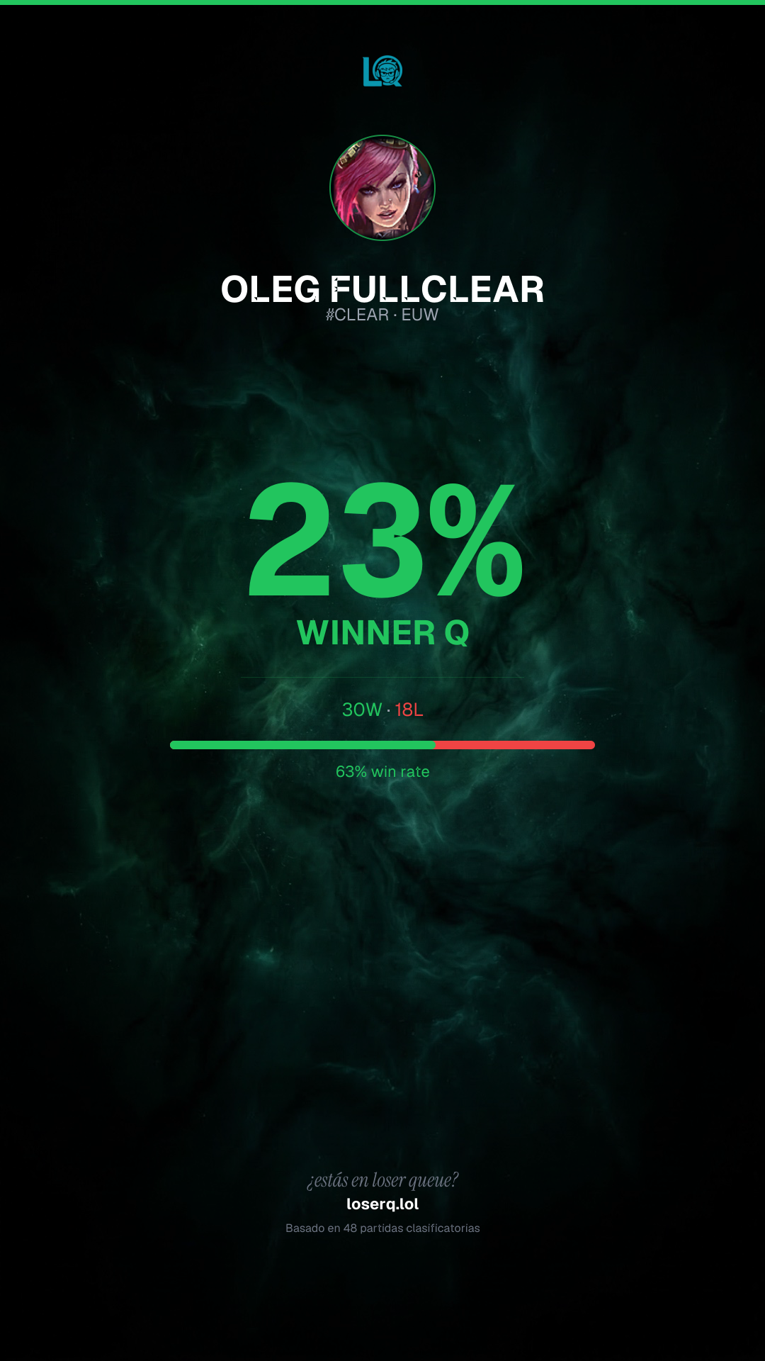 30 victorias, 18 derrotas — 62% de win rate. Un buen desempeño.