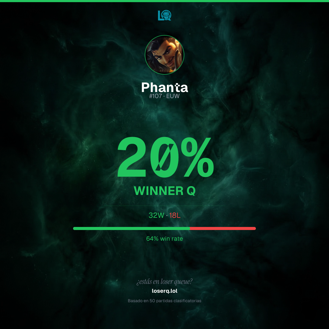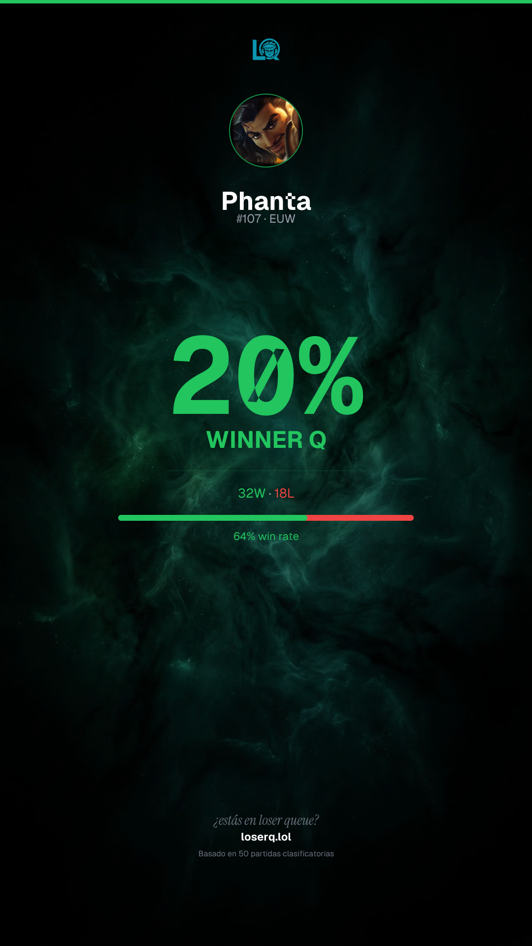 32 victorias, 18 derrotas — 64% de win rate. Un buen desempeño.
