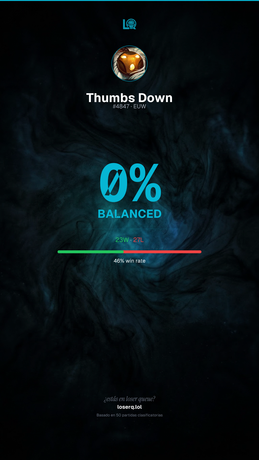 23 victorias, 27 derrotas — 46% de win rate.