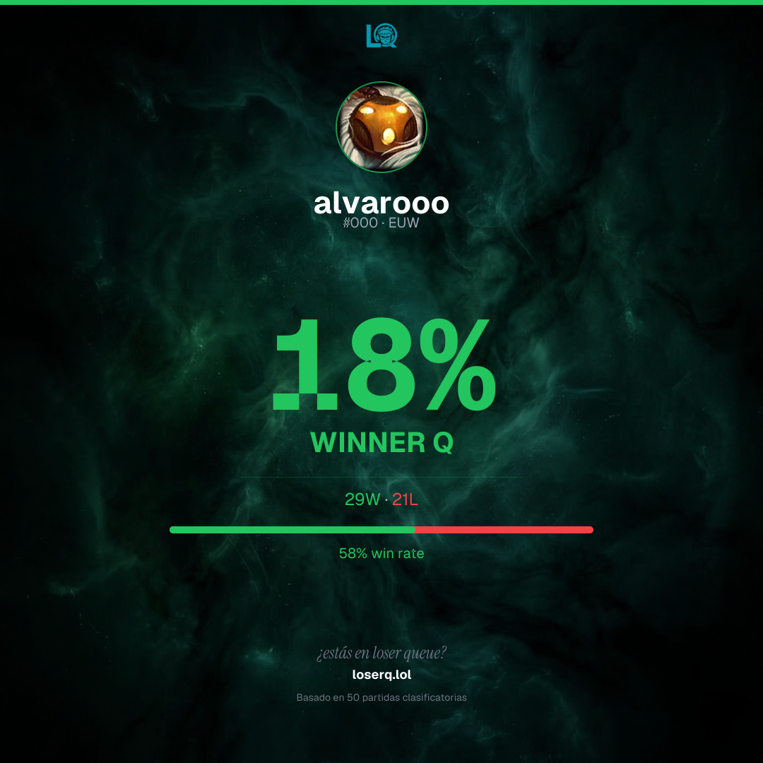 29 victorias, 21 derrotas — 58% de win rate. Un buen desempeño.
