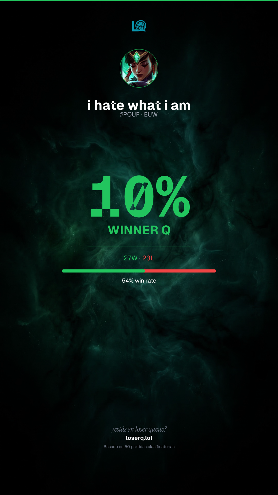 27 victorias, 23 derrotas — 54% de win rate.