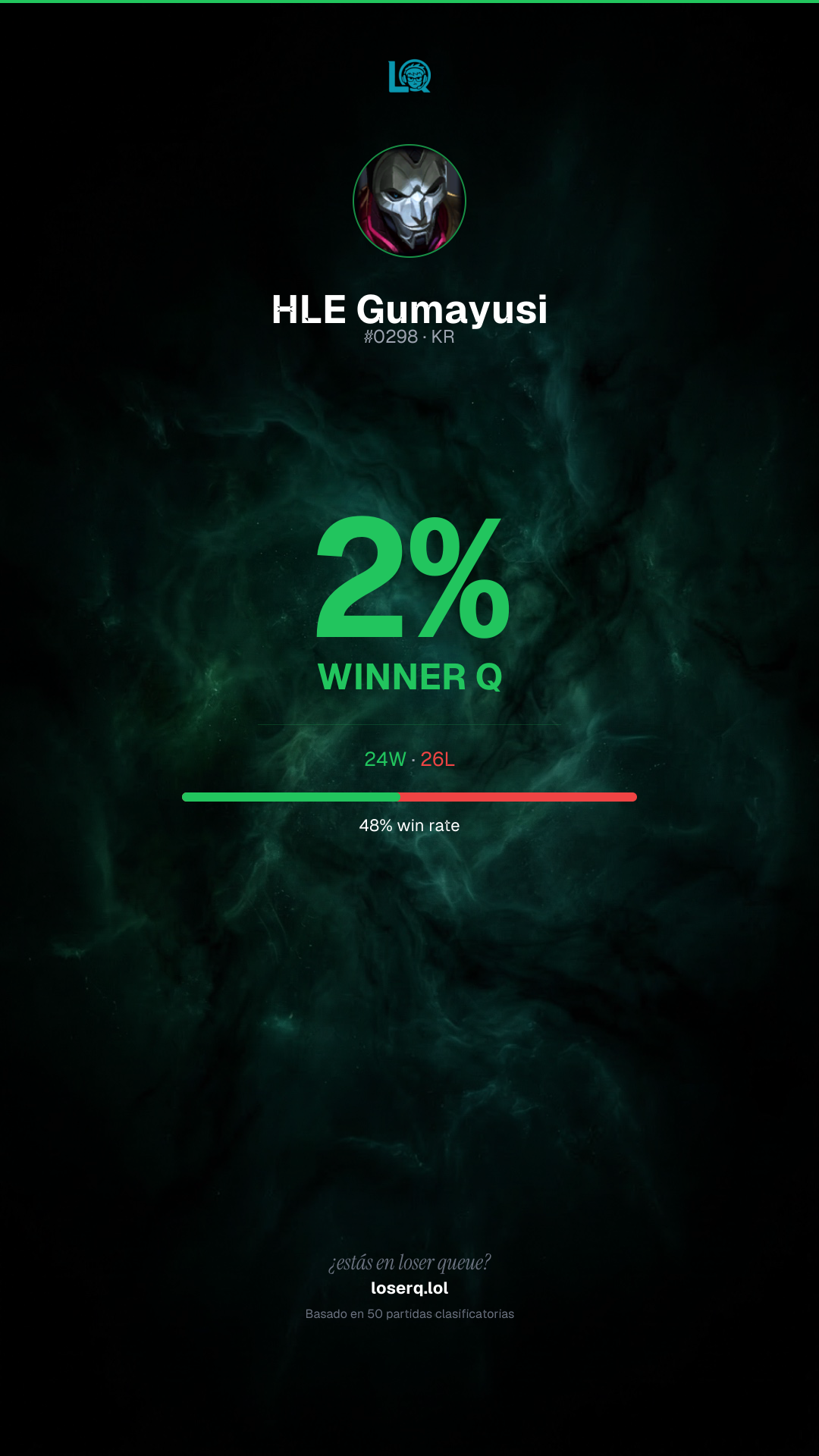 24 victorias, 26 derrotas — 48% de win rate.