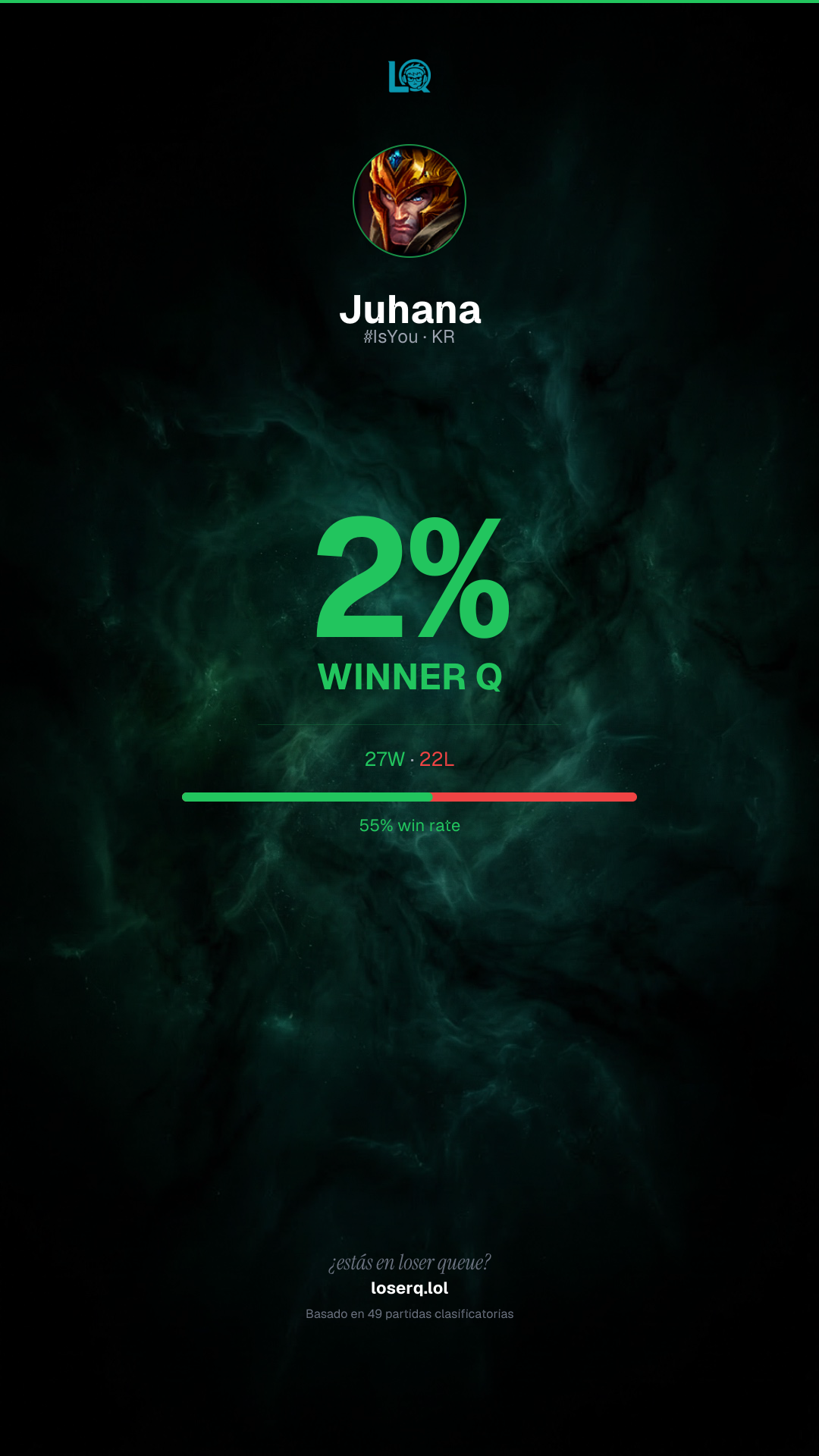 27 victorias, 22 derrotas — 55% de win rate. Un buen desempeño.