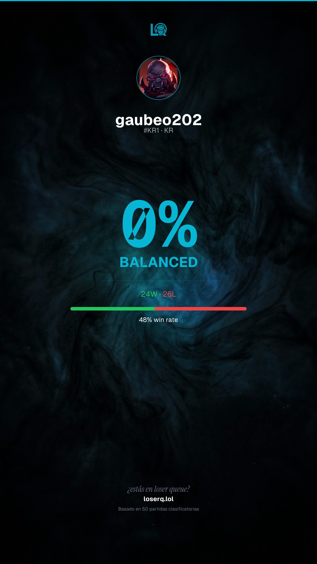 24 victorias, 26 derrotas — 48% de win rate.