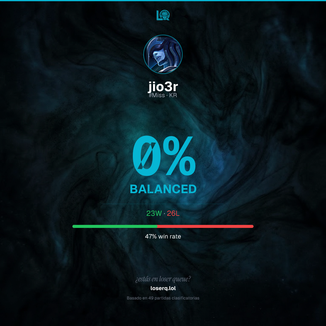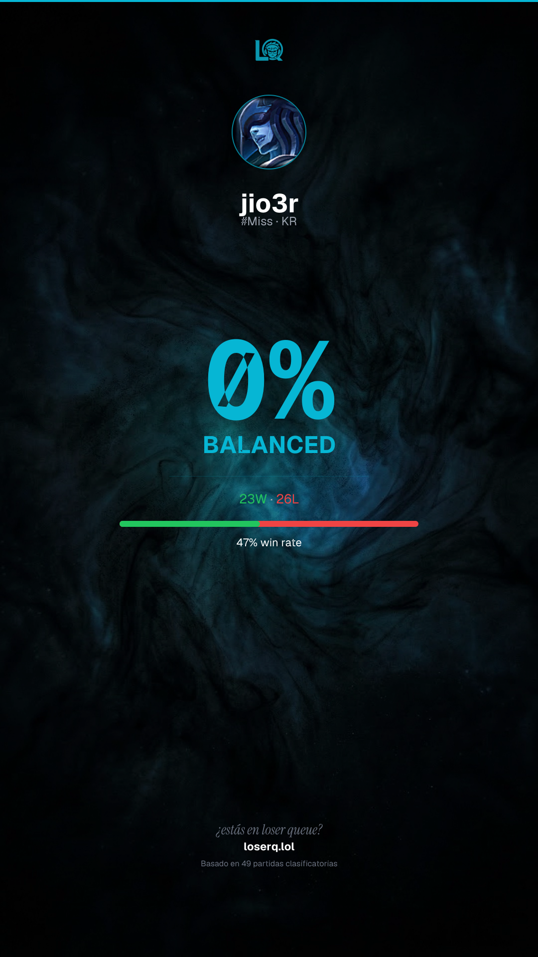 23 victorias, 26 derrotas — 46% de win rate.