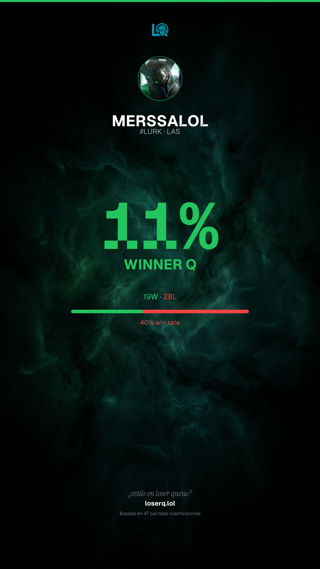 19 victorias, 28 derrotas — 40% de win rate. Ha sido una racha difícil.