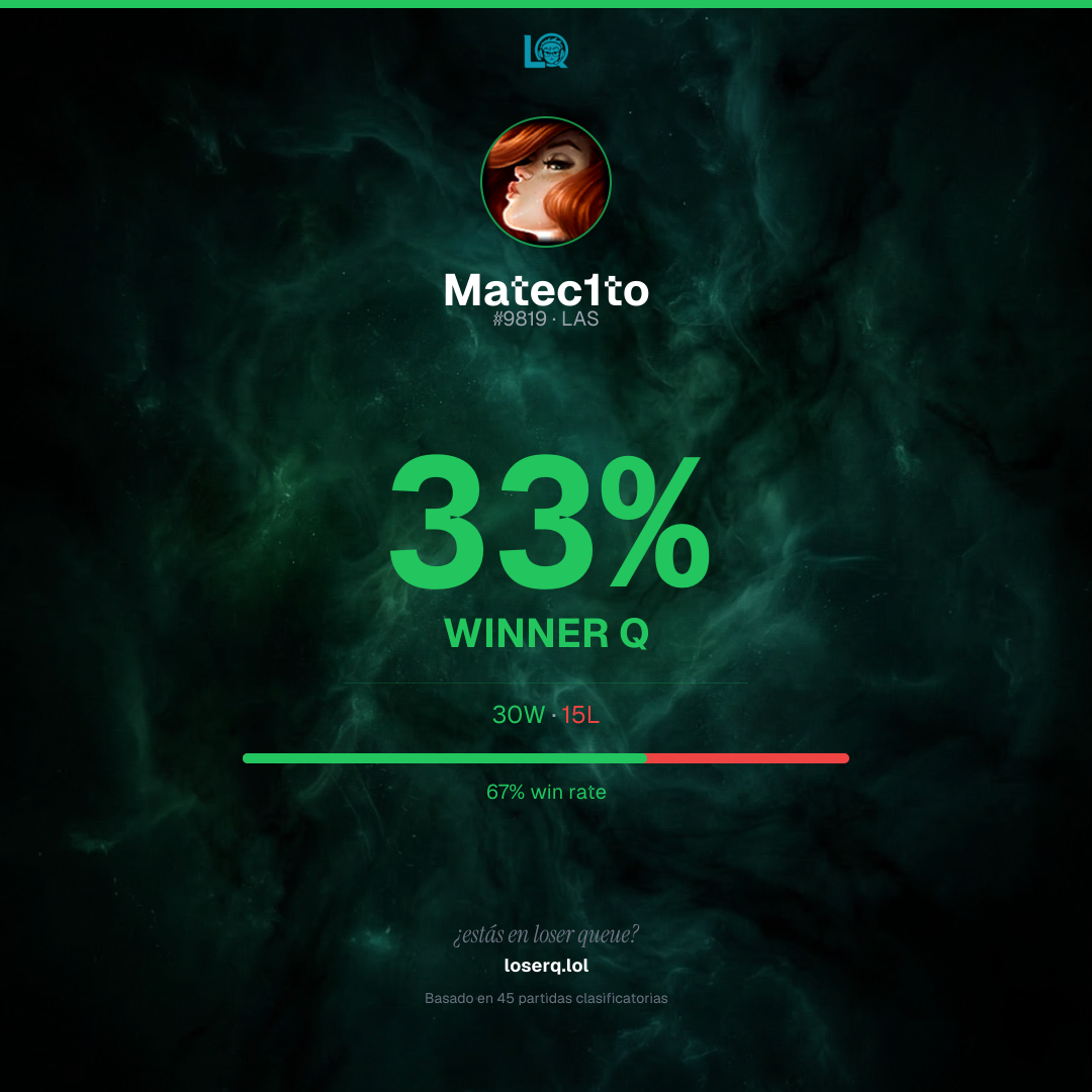30 victorias, 15 derrotas — 66% de win rate. Un buen desempeño.