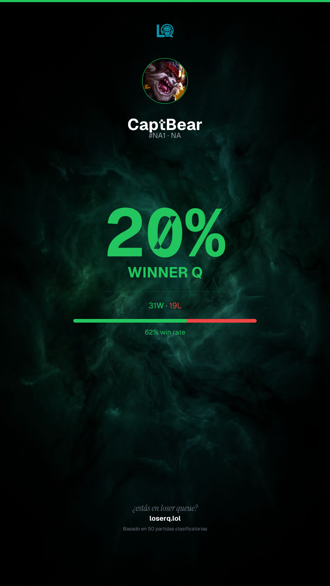 31 victorias, 19 derrotas — 62% de win rate. Un buen desempeño.