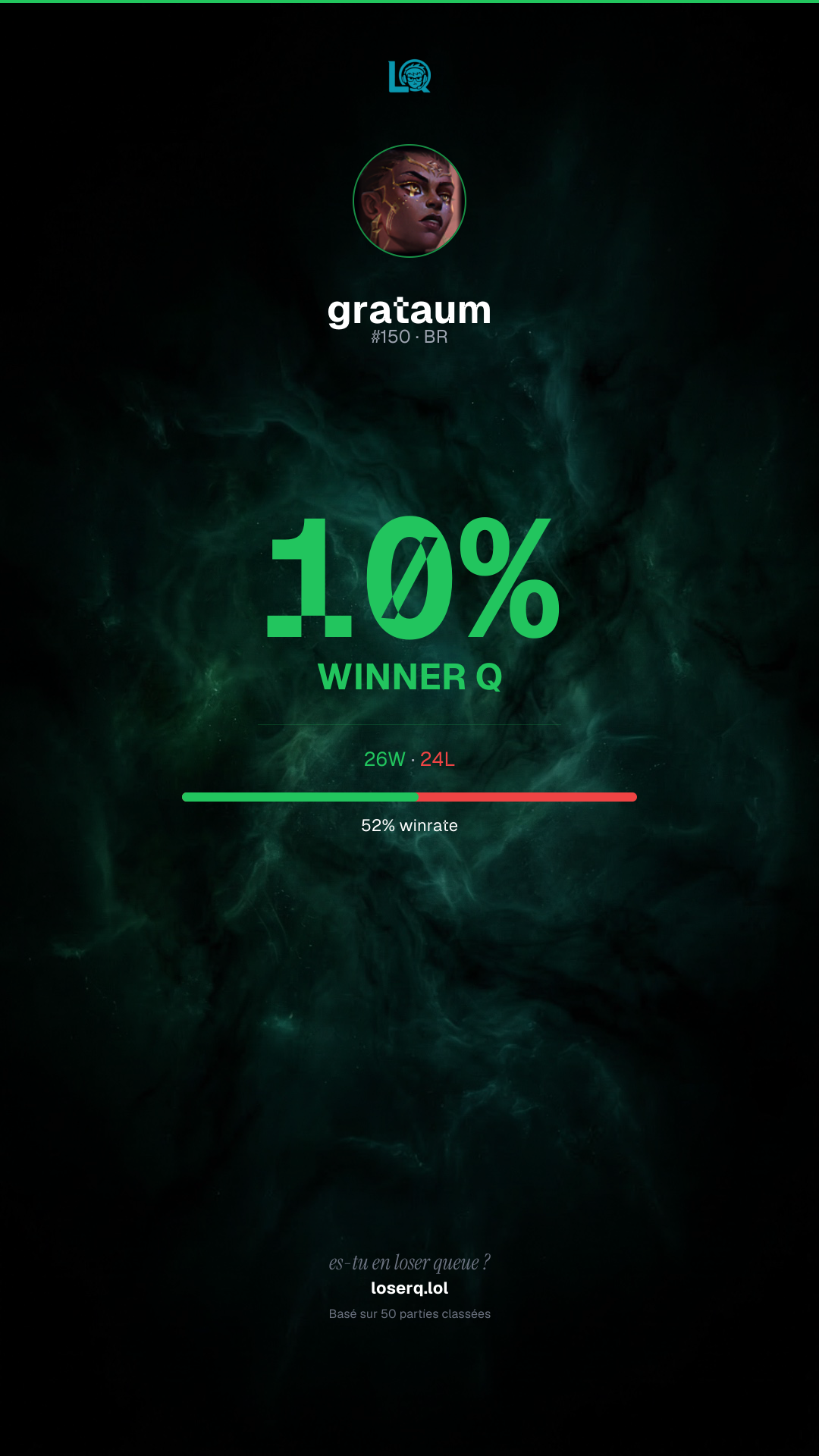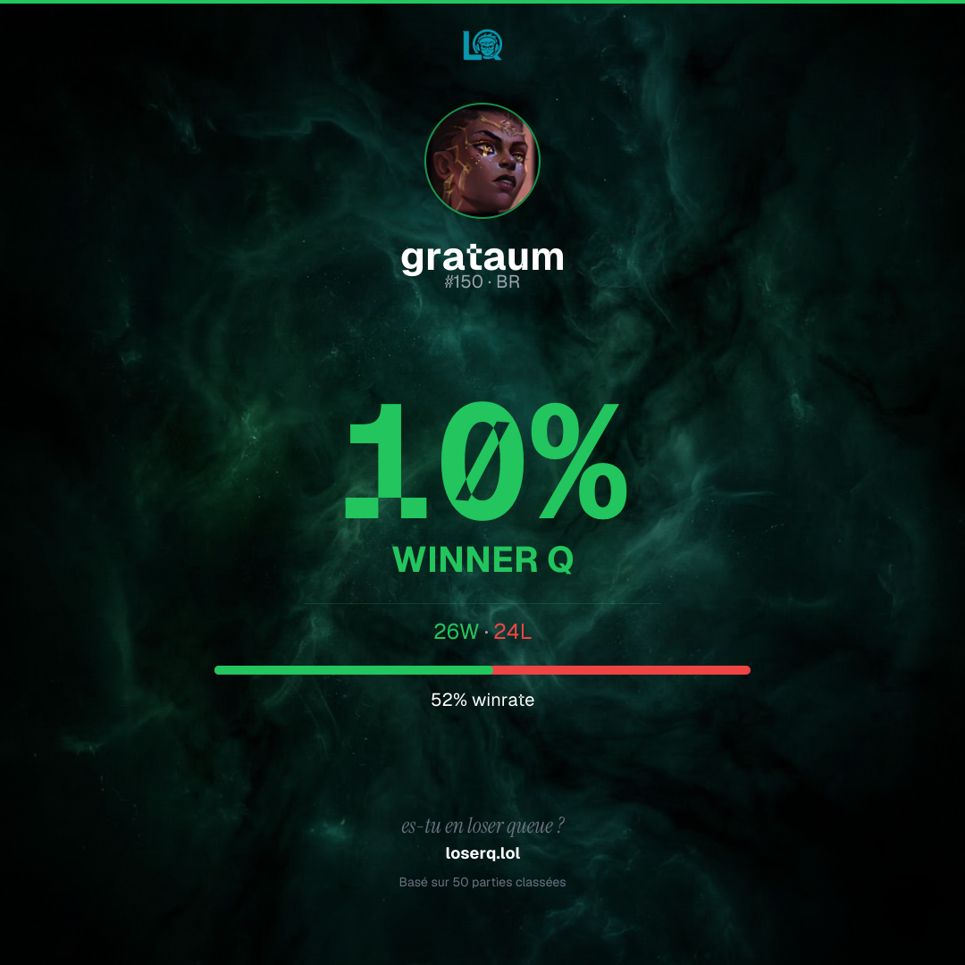26 victoires, 24 défaites — un winrate de 52%.