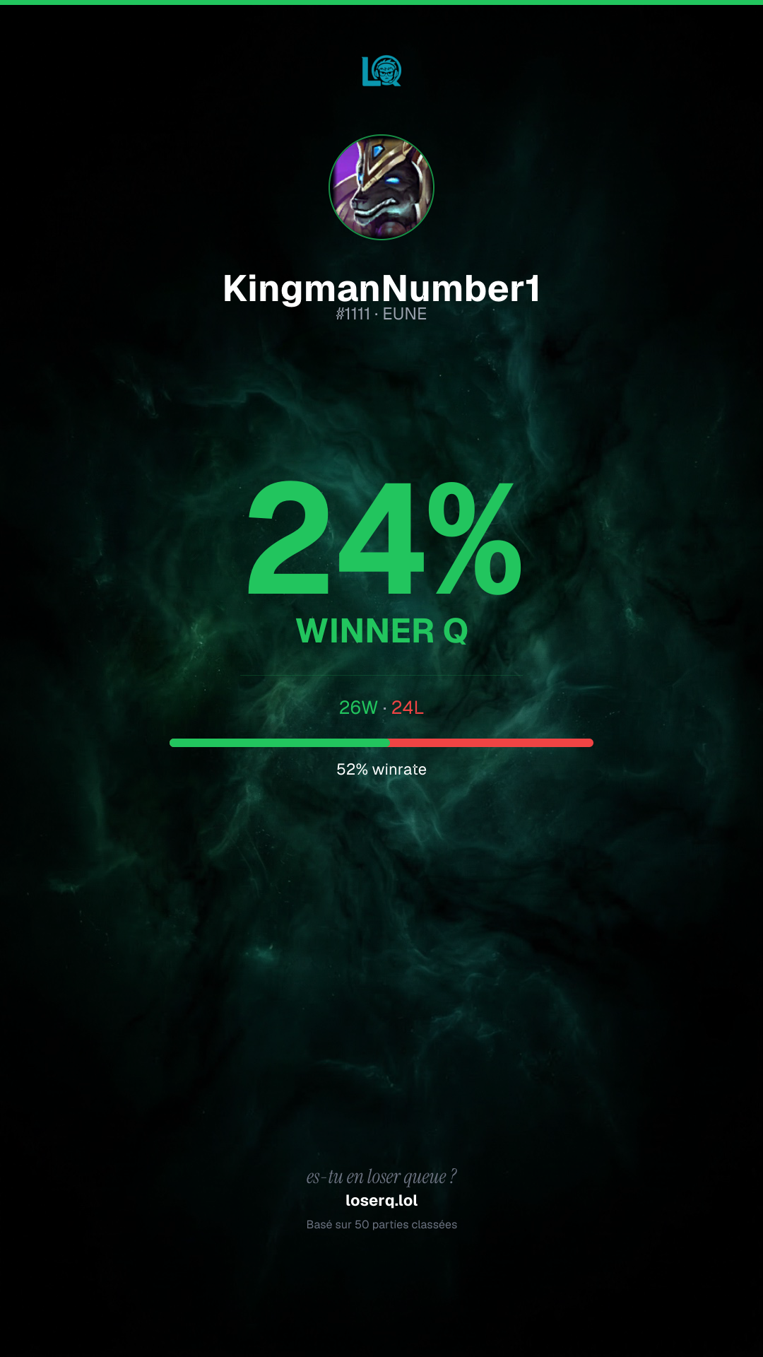 26 victoires, 24 défaites — un winrate de 52%.