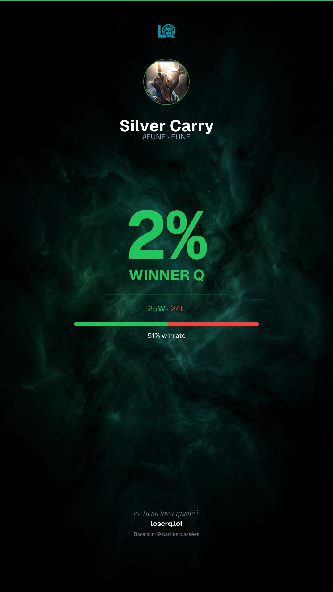 25 victoires, 24 défaites — un winrate de 51%.