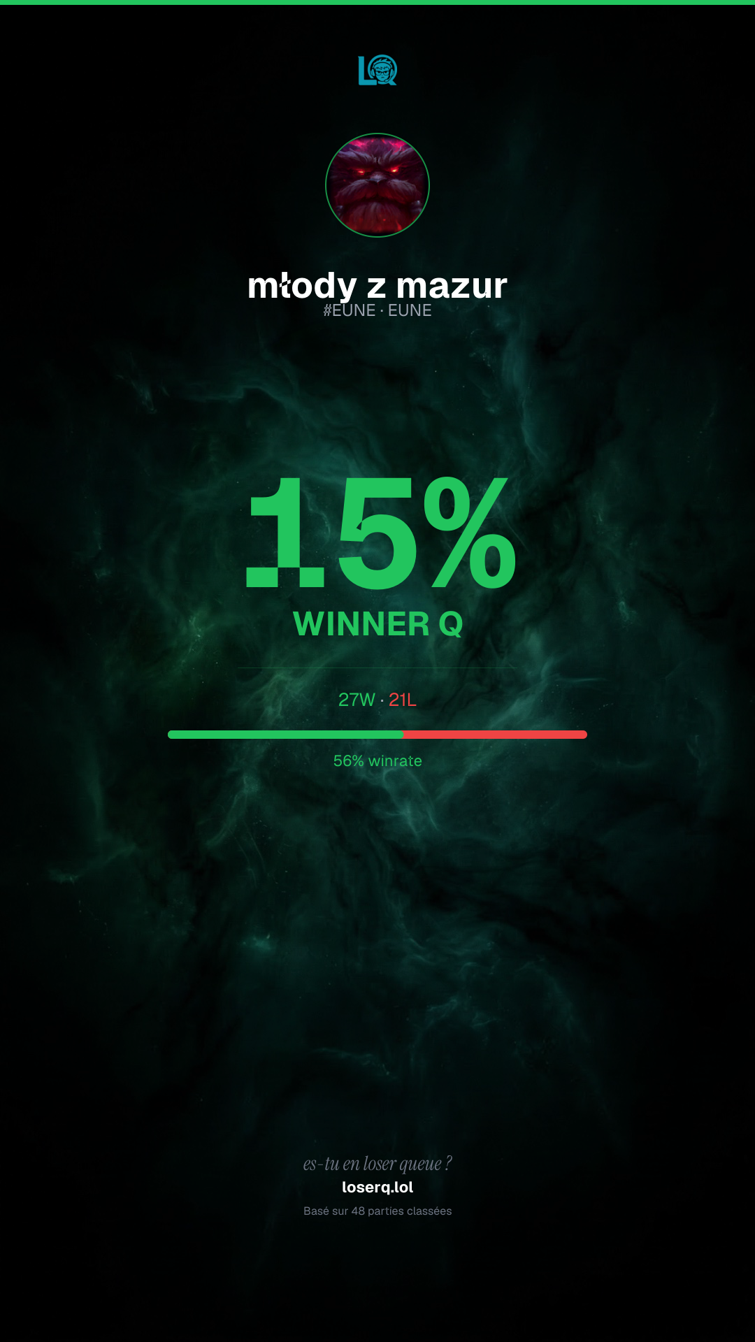 27 victoires, 21 défaites — un winrate de 56%. Belle performance.
