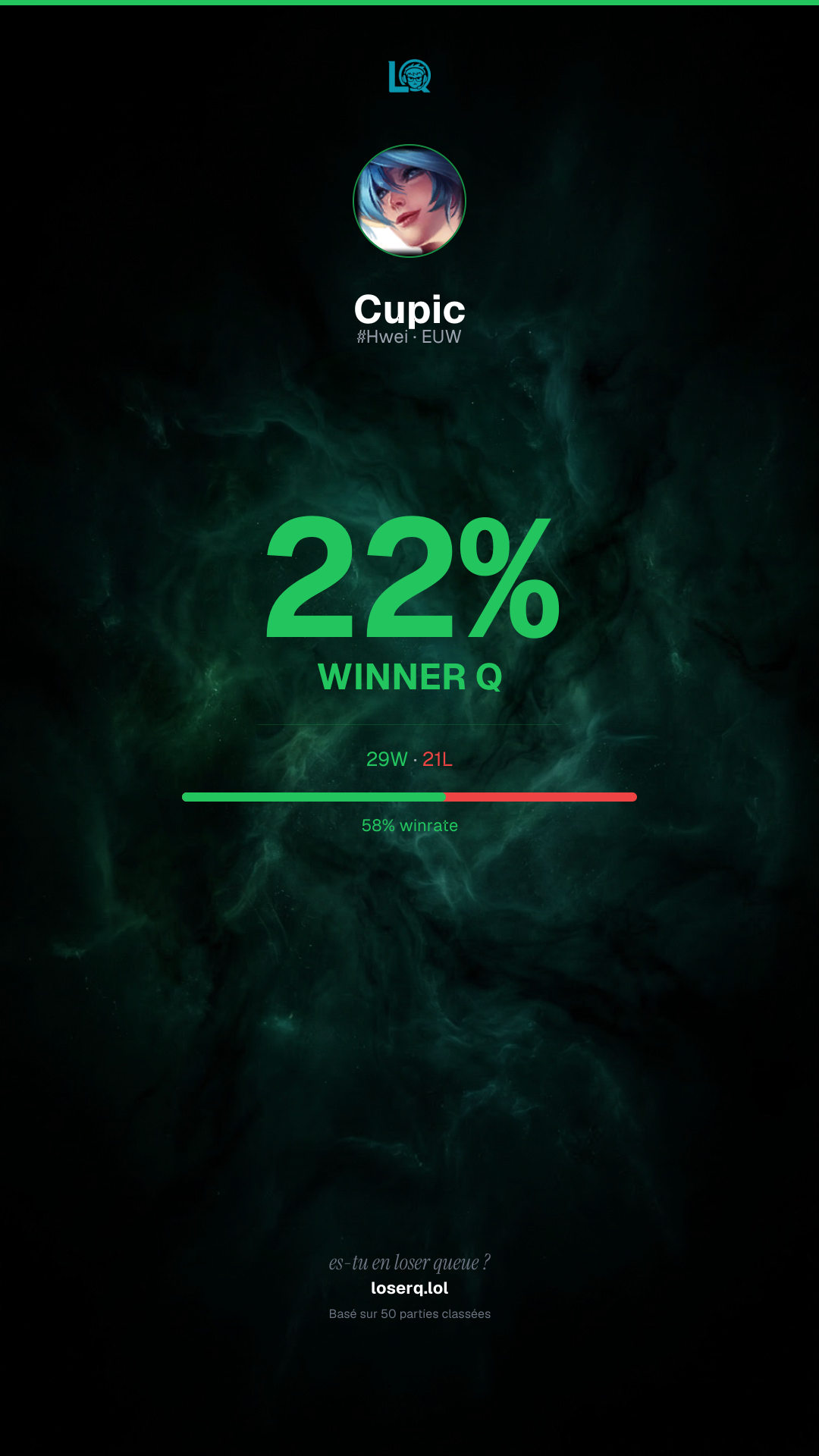 29 victoires, 21 défaites — un winrate de 58%. Belle performance.