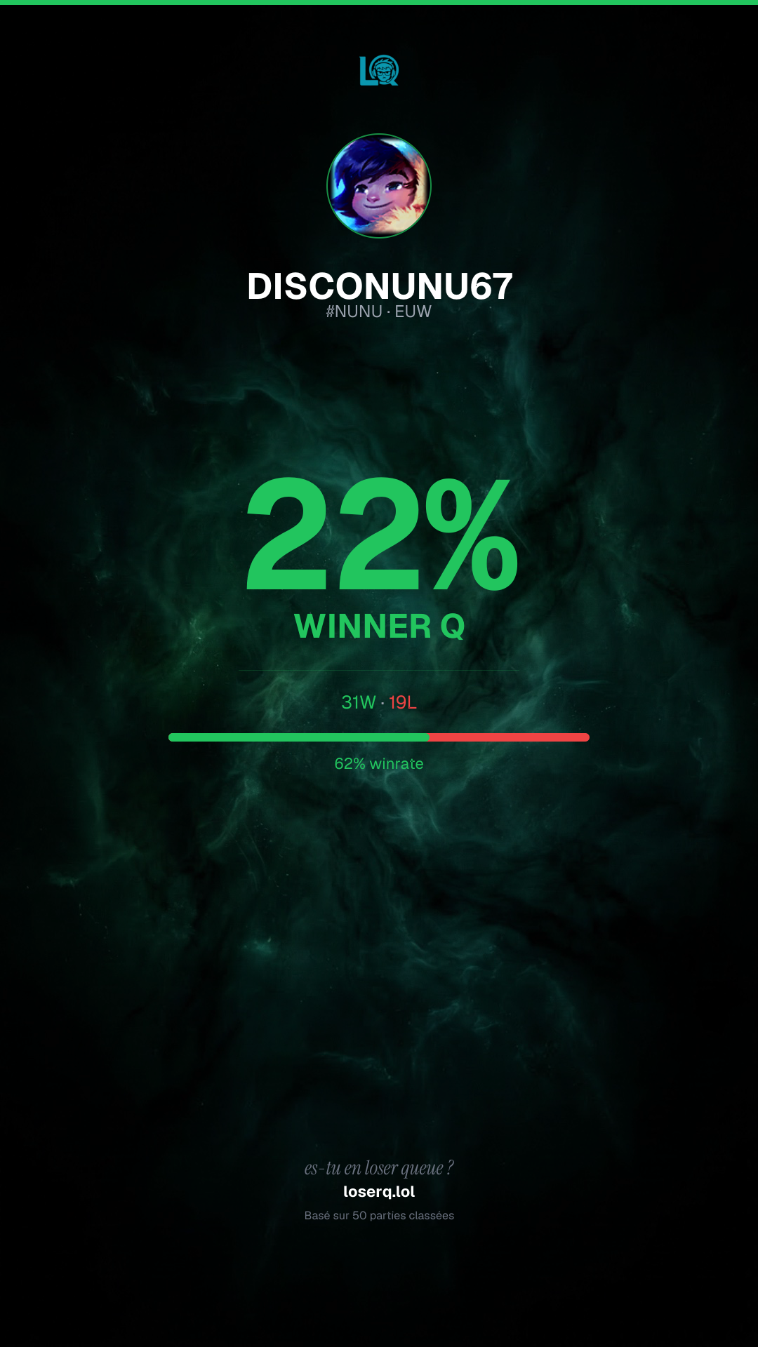 31 victoires, 19 défaites — un winrate de 62%. Belle performance.