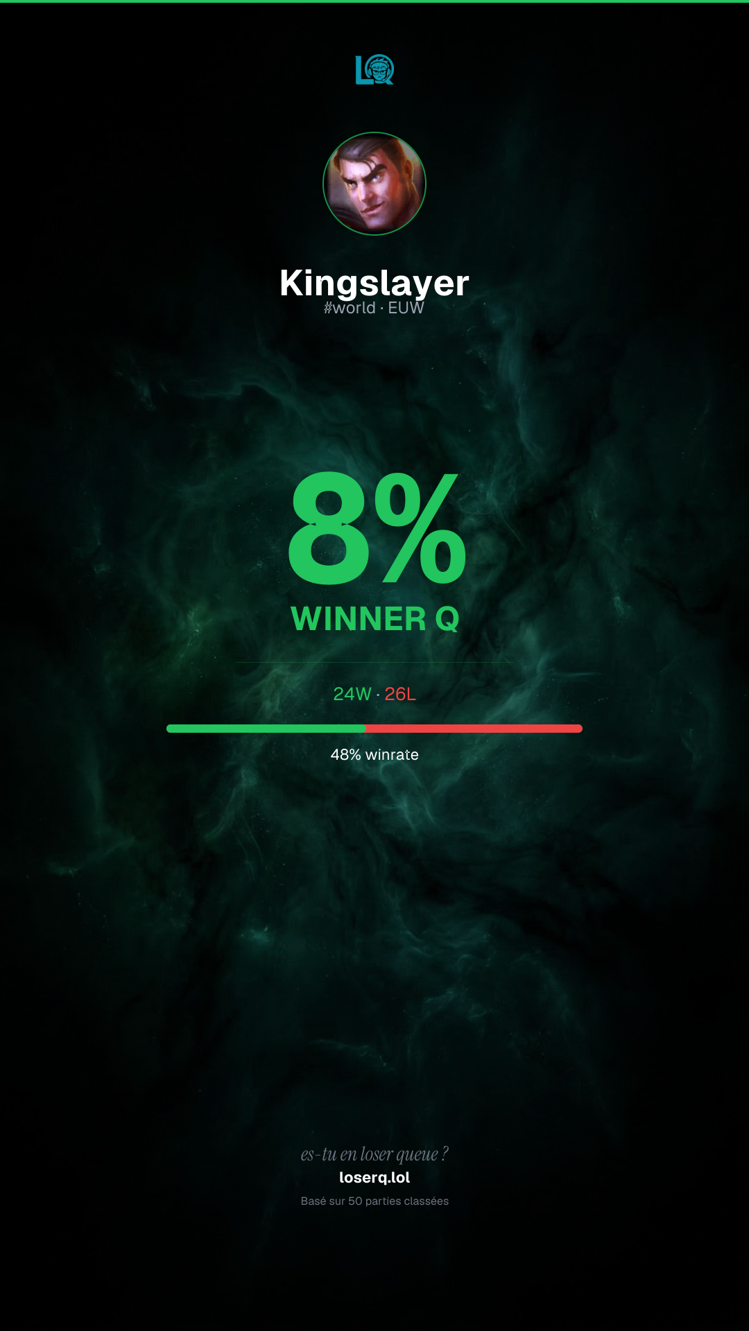 24 victoires, 26 défaites — un winrate de 48%.