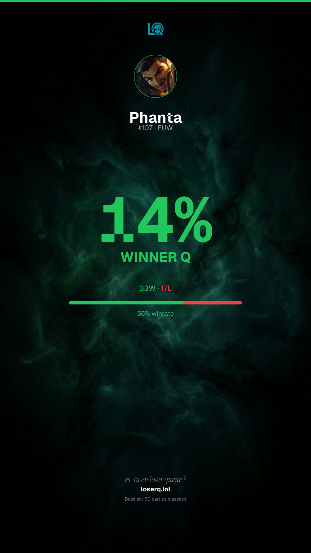 33 victoires, 17 défaites — un winrate de 66%. Belle performance.