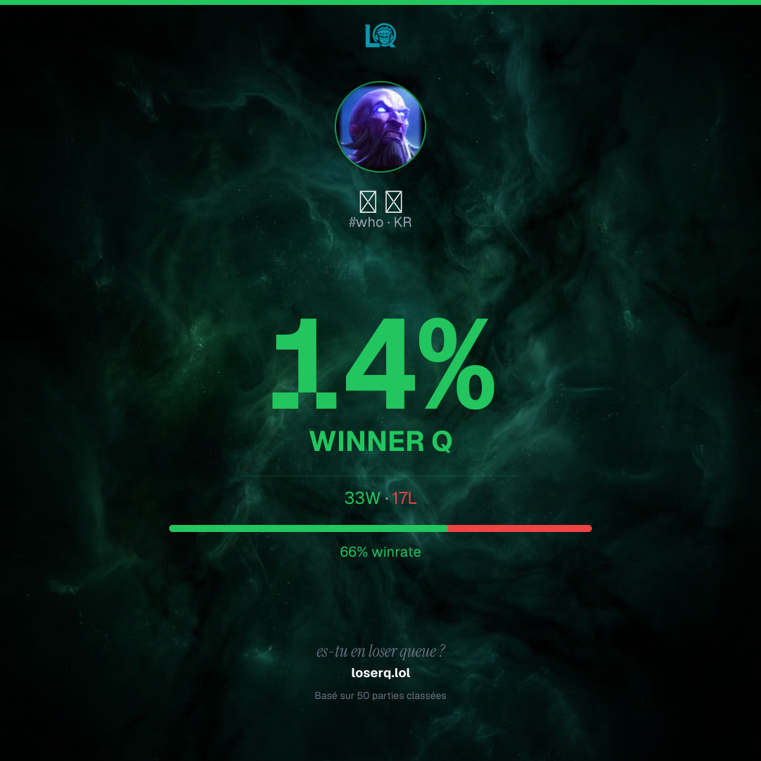 33 victoires, 17 défaites — un winrate de 66%. Belle performance.