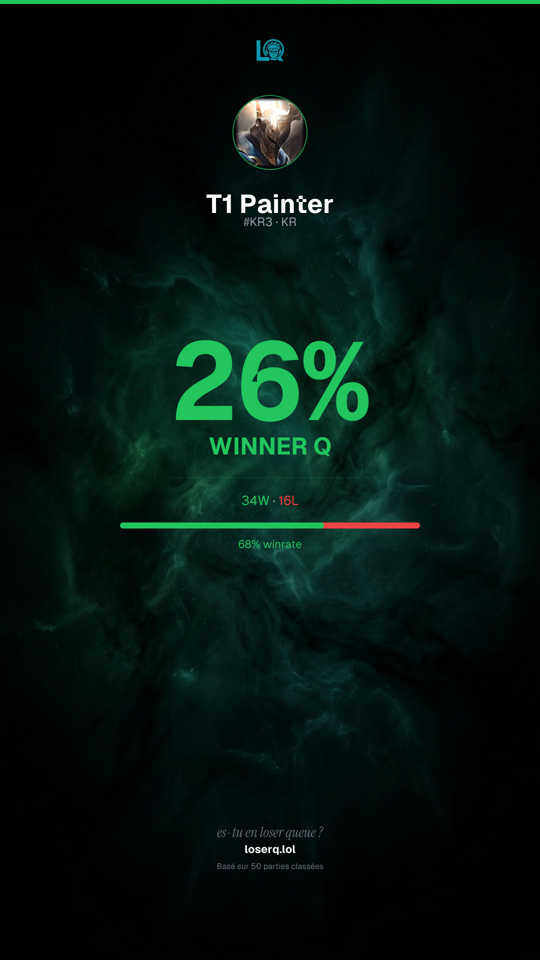 34 victoires, 16 défaites — un winrate de 68%. Belle performance.