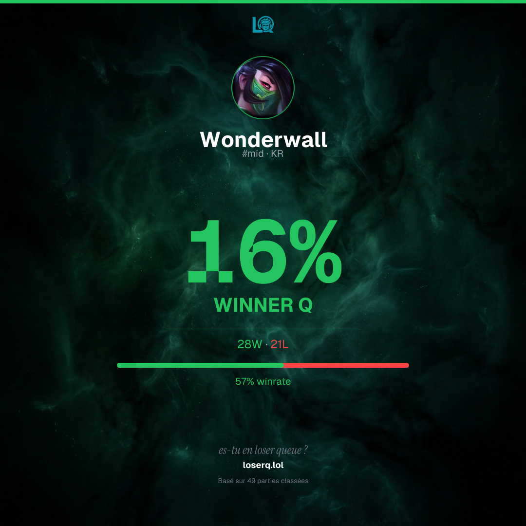 28 victoires, 21 défaites — un winrate de 57%. Belle performance.