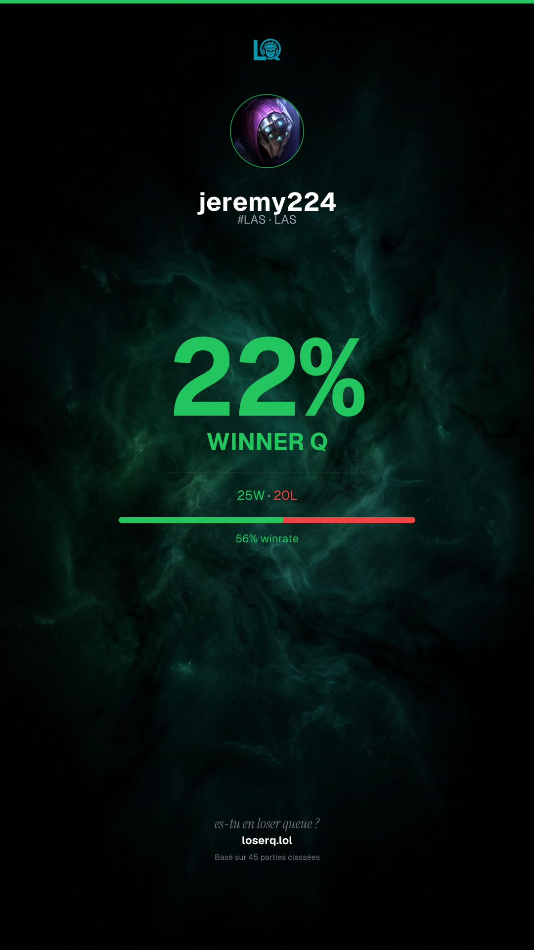25 victoires, 20 défaites — un winrate de 55%. Belle performance.