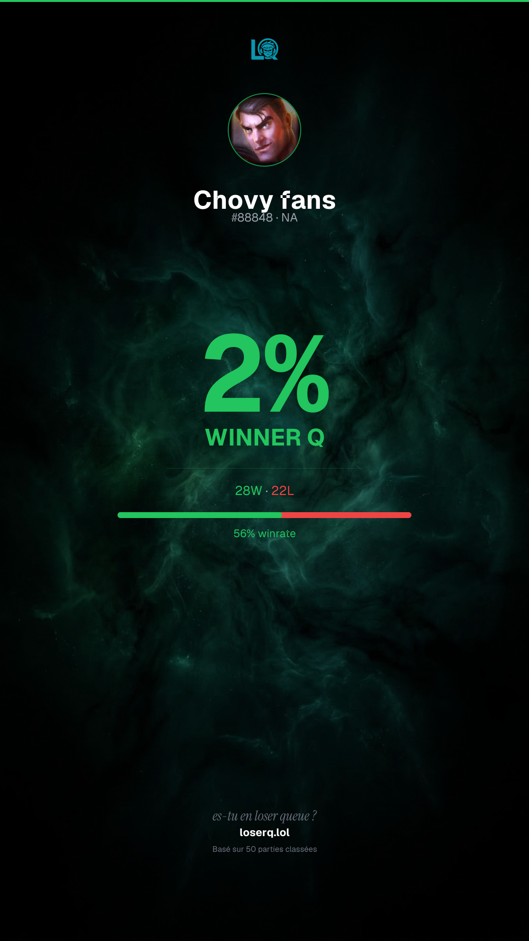 28 victoires, 22 défaites — un winrate de 56%. Belle performance.