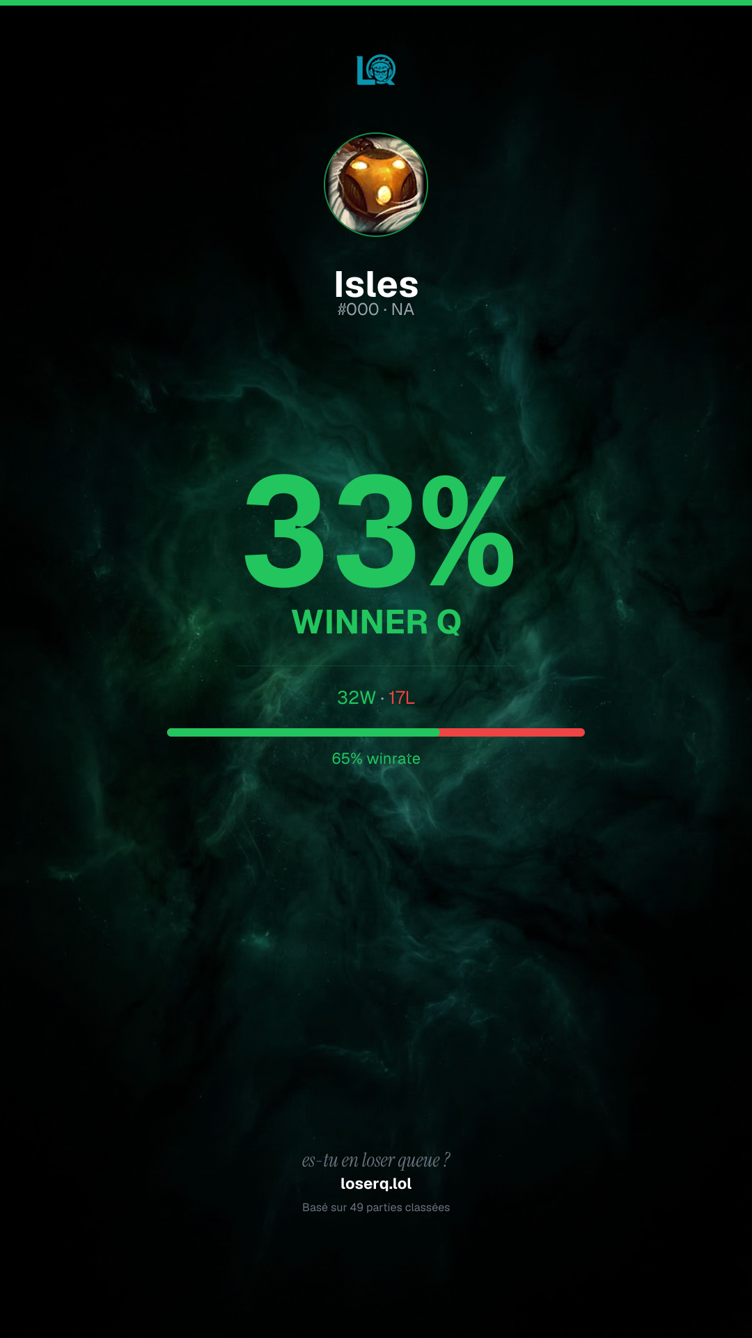 32 victoires, 17 défaites — un winrate de 65%. Belle performance.