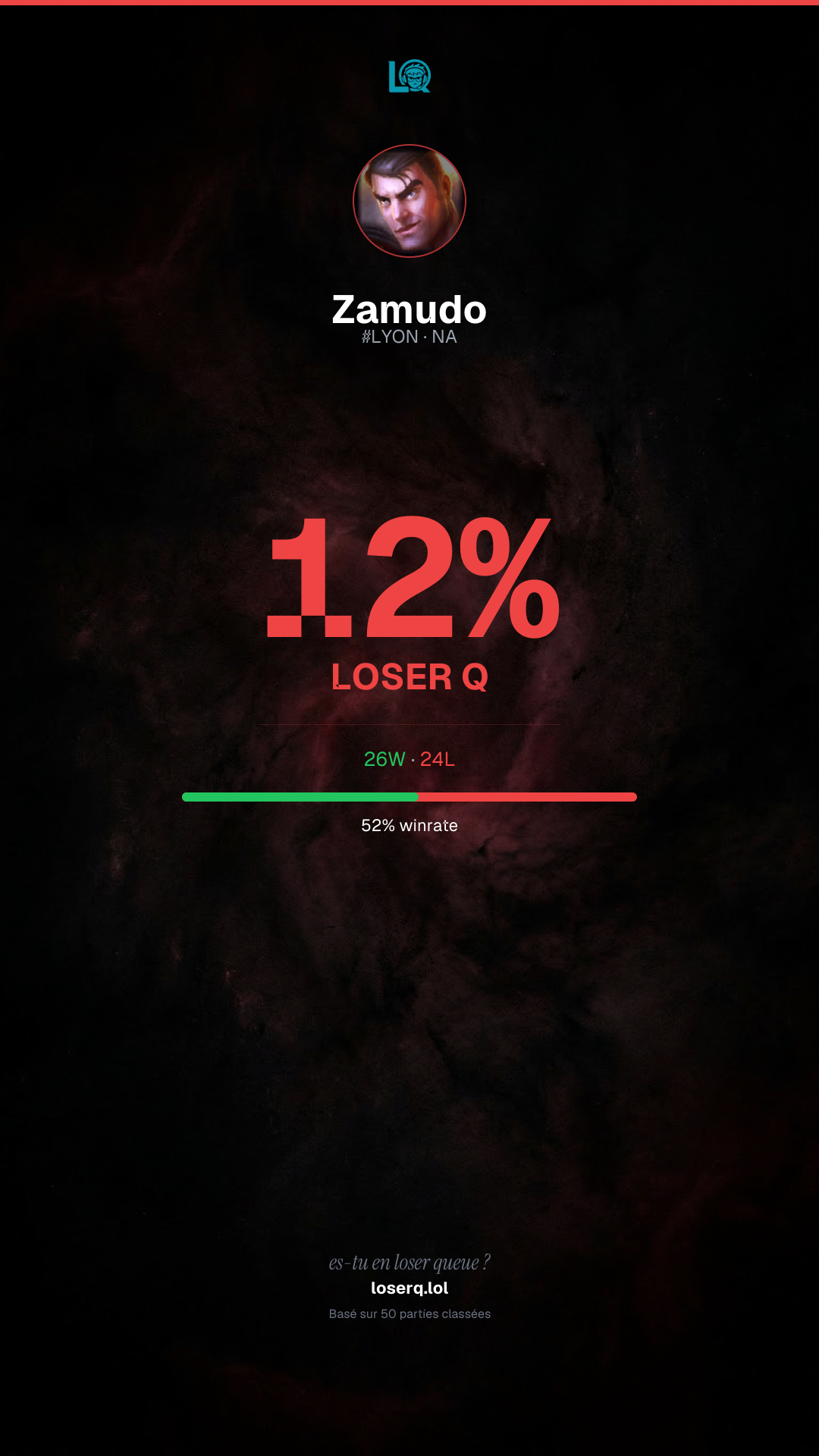 26 victoires, 24 défaites — un winrate de 52%.