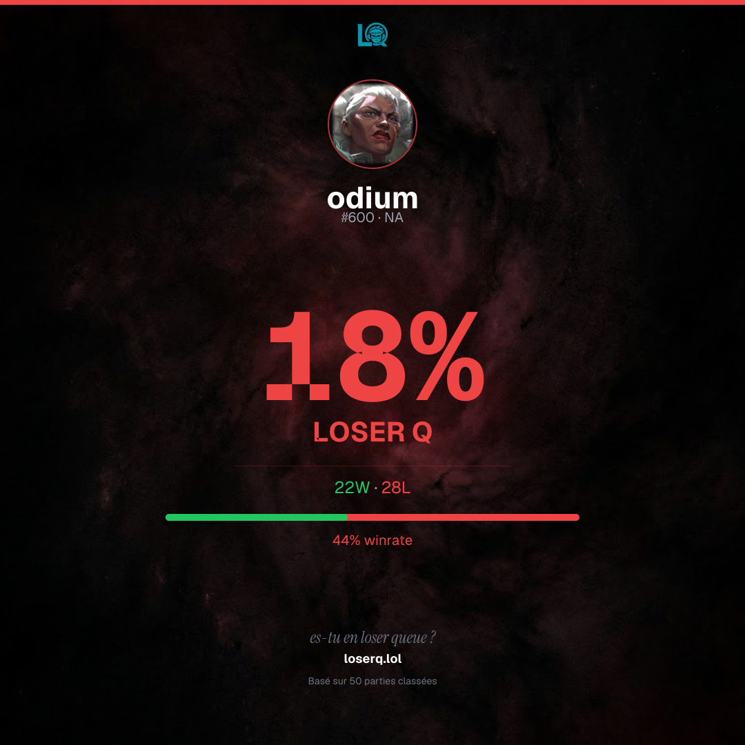 22 victoires, 28 défaites — un winrate de 44%. Une période difficile.