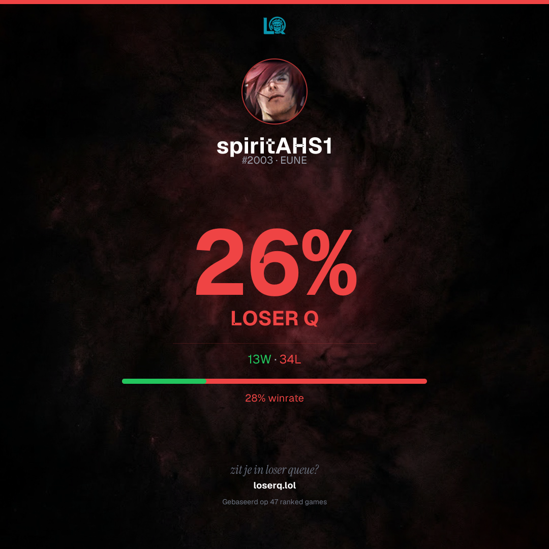 13 overwinningen, 34 nederlagen — een winrate van 27%. Een lastige periode.
