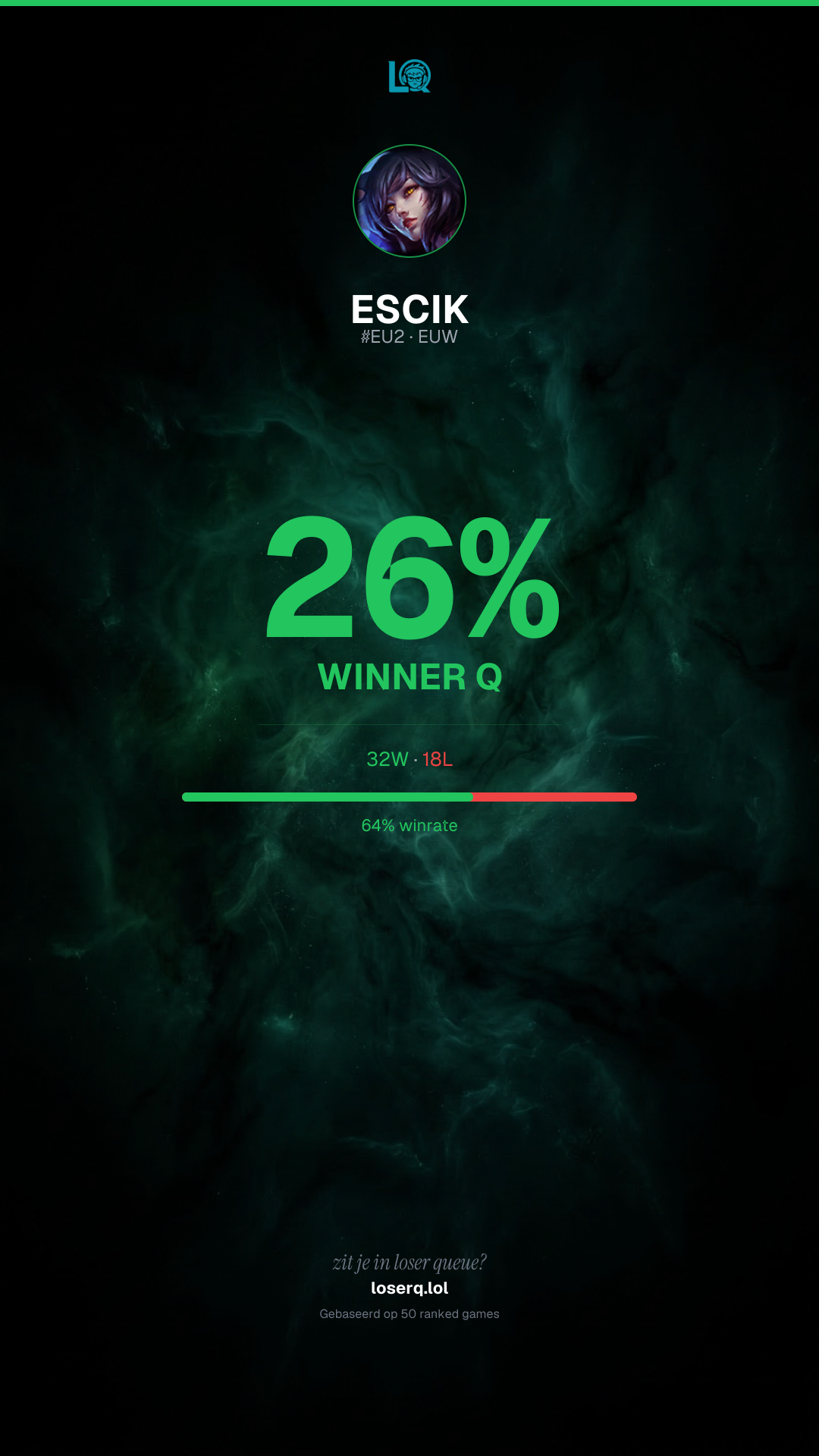 32 overwinningen, 18 nederlagen — een winrate van 64%. Sterke prestatie.